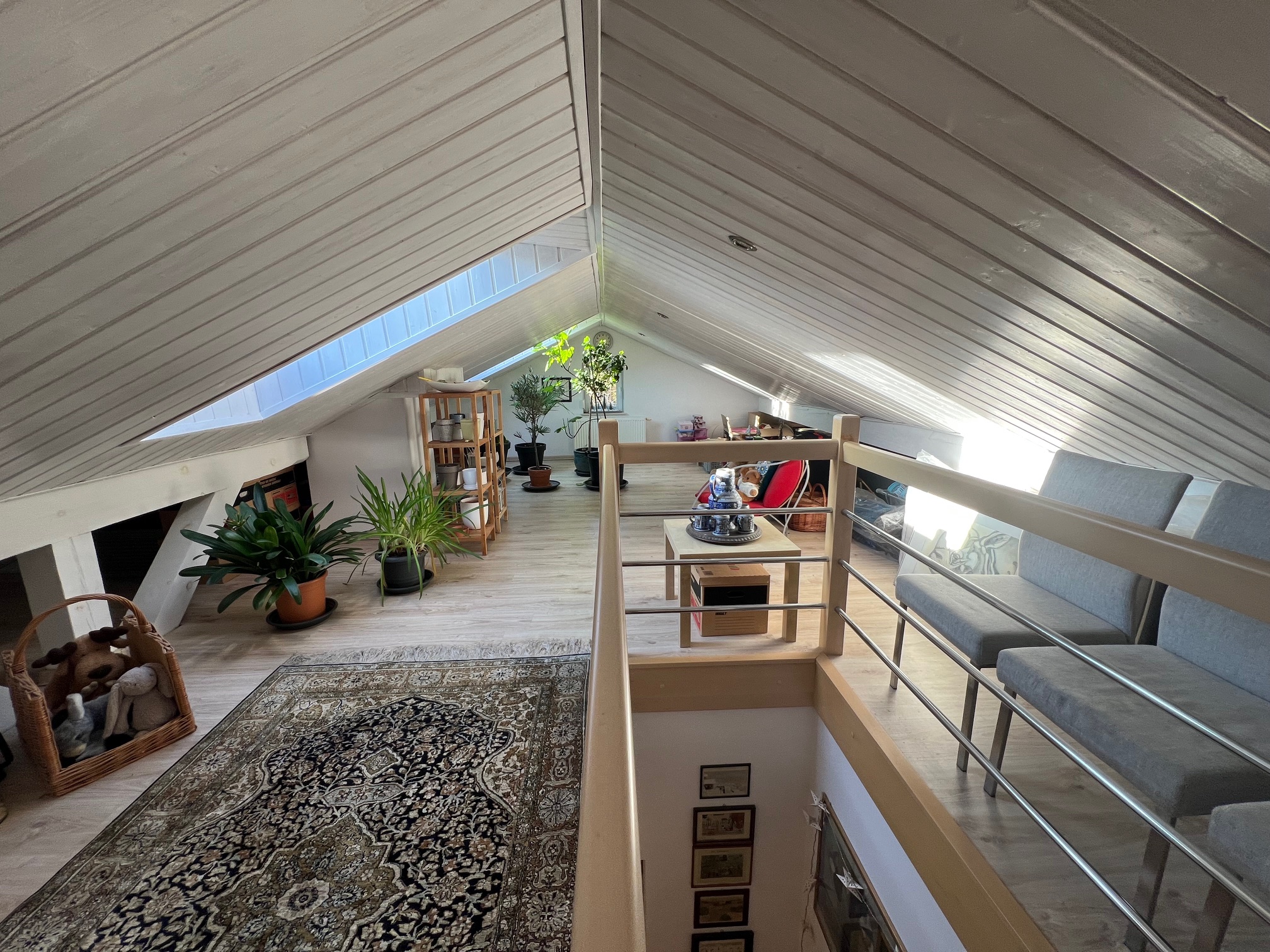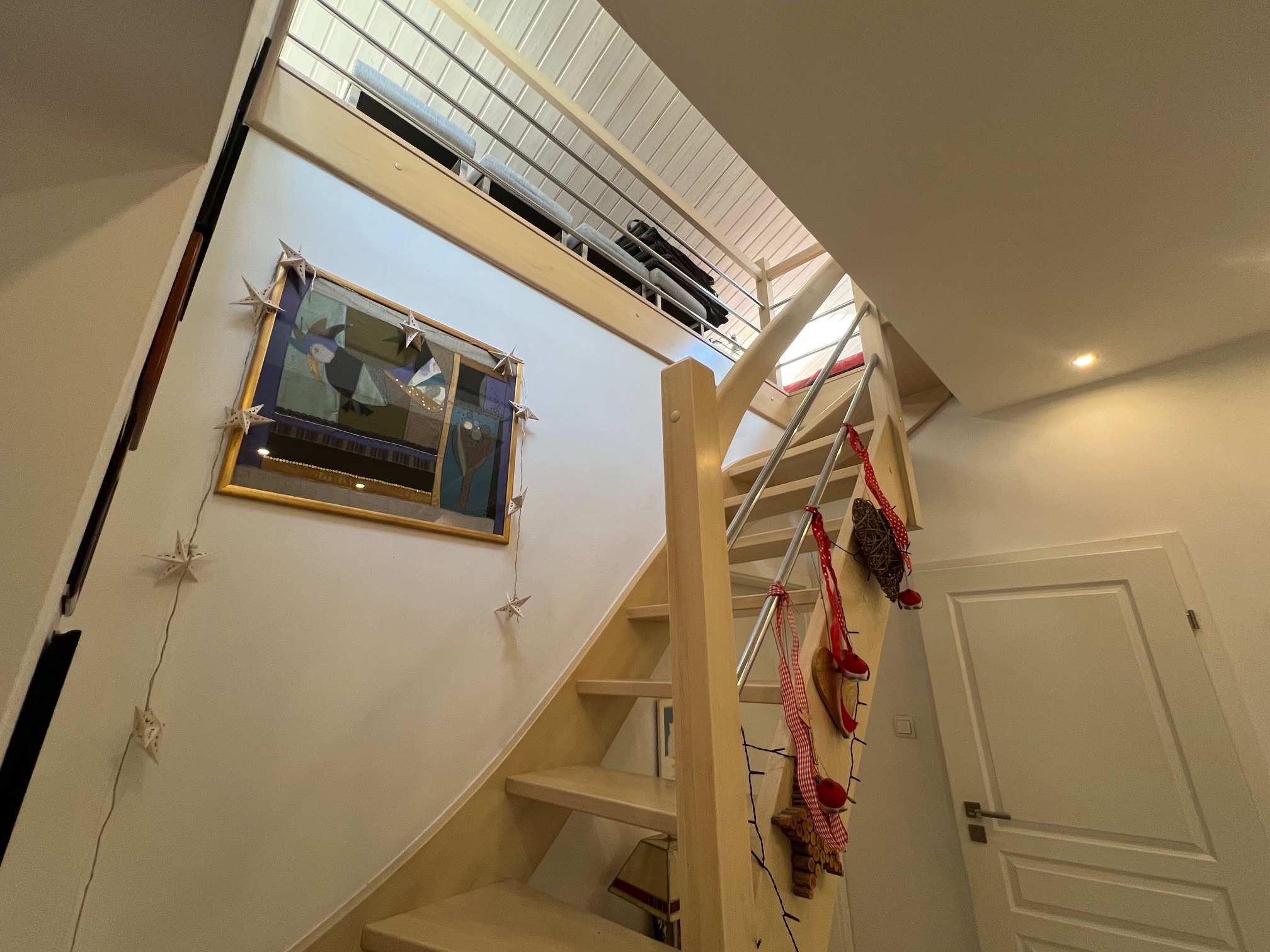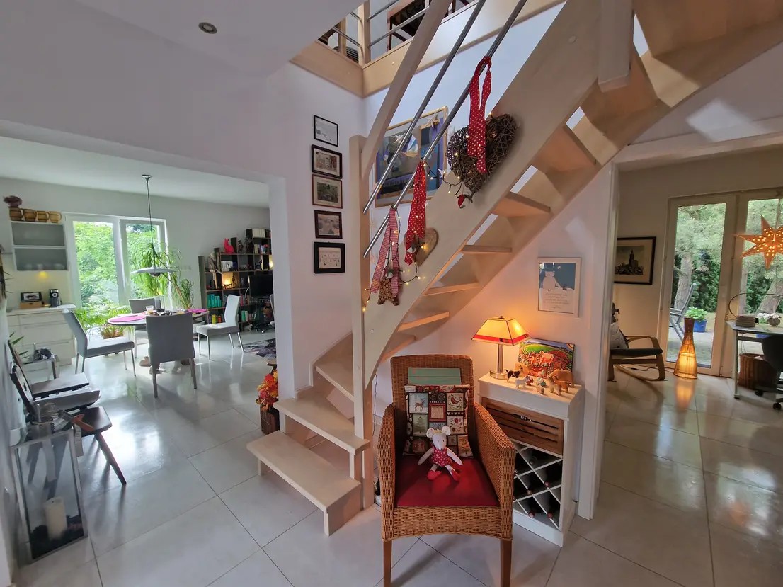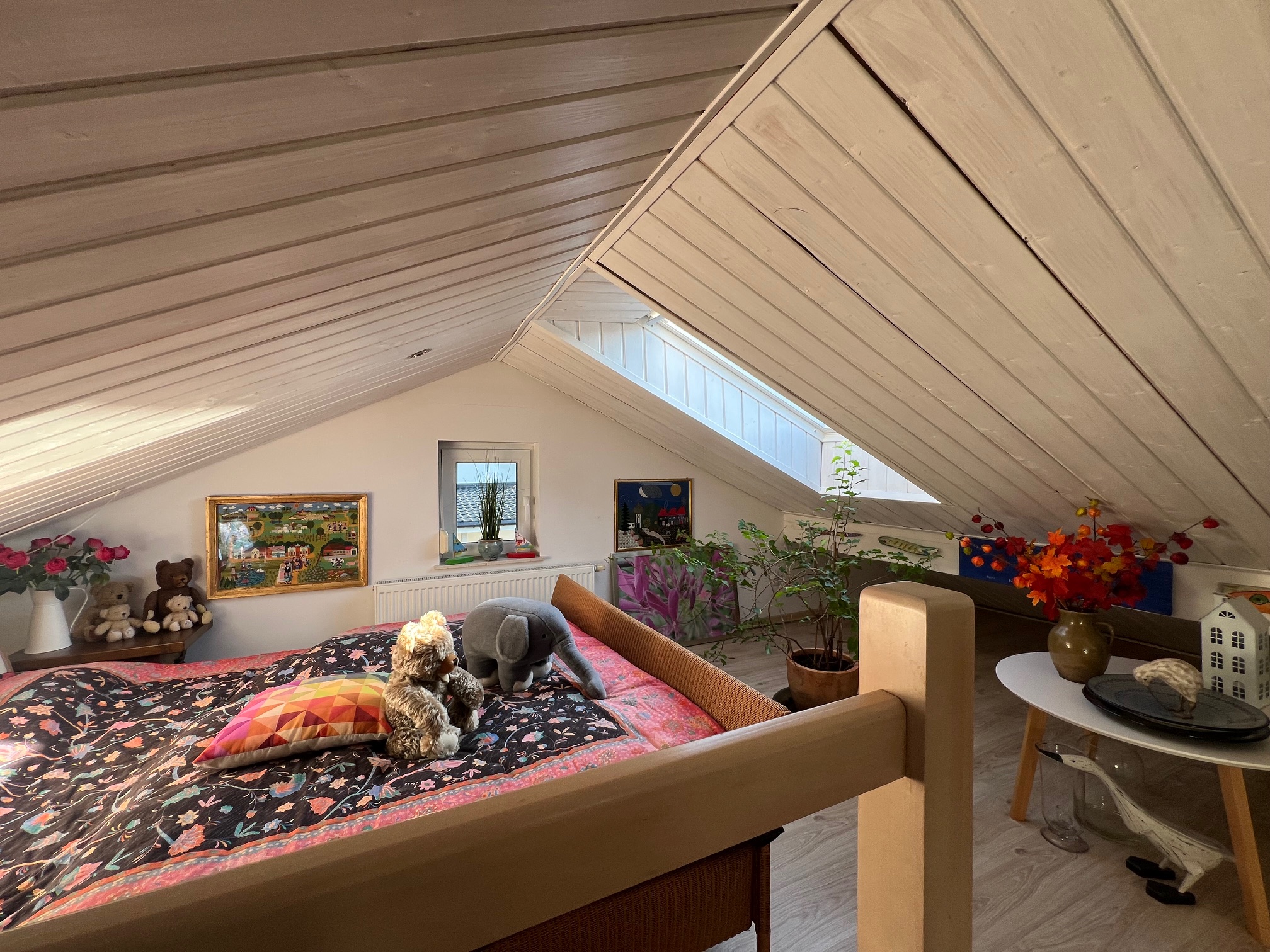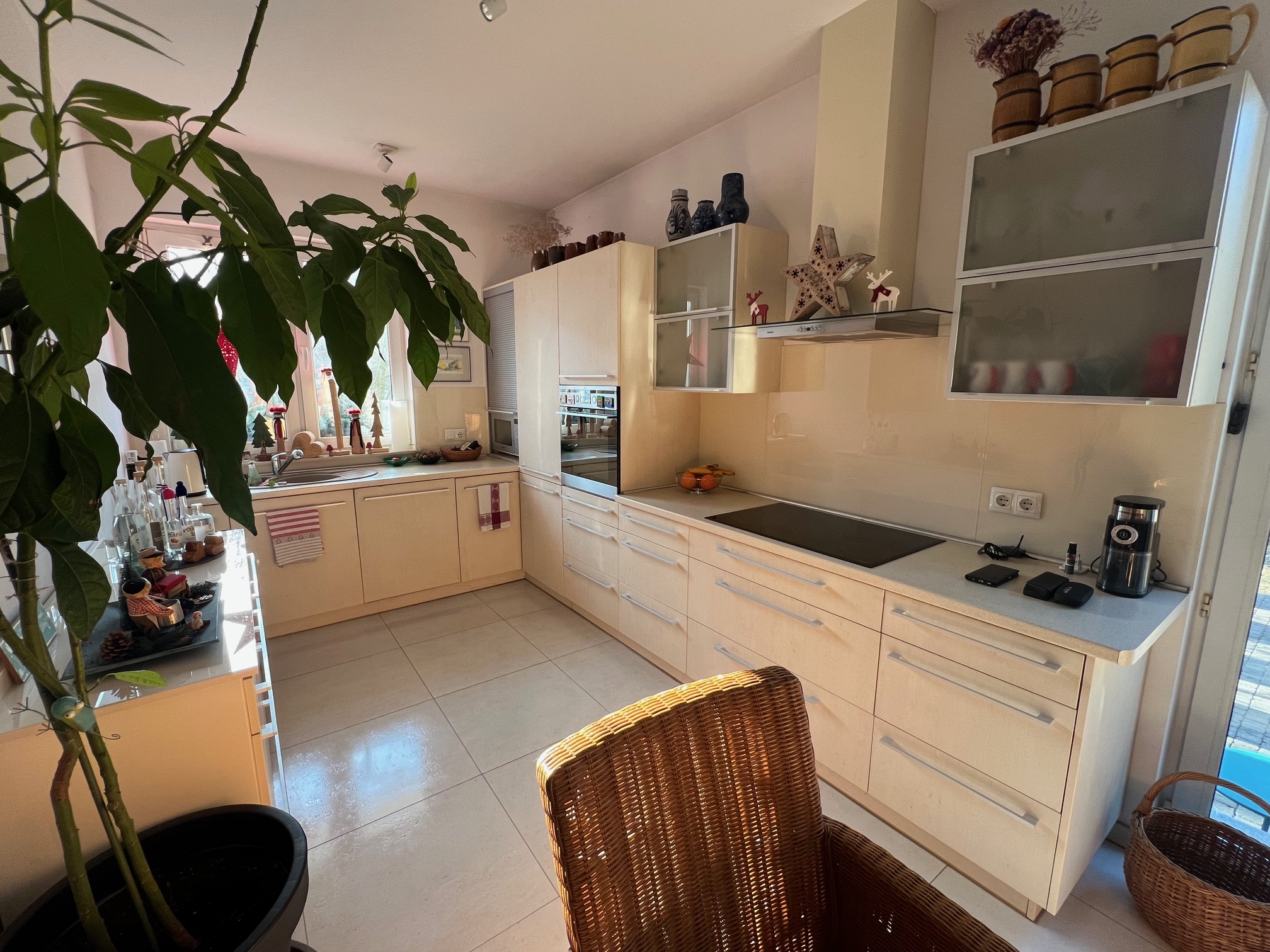 Durch die straßenseitige Haustür gelangt man durch einen kleinen Eingangsbereich in das Herzstück des Hauses, in den offenen Wohnbereich mit angrenzender Küche und Zugang zur Terrasse. Auf eine zweite Terrasse gelangt man durch die bodentiefen Fenster. Zwei weitere Zimmer und ein sehr schön ausgestattetes Bad befinden sich auf der anderen Seite. Eine Fußbodenheizung gehört ebenso zur Ausstattung, wie eine Einbauküche und elektrische Rollläden. Im EG sind alle Räume mit hochwertigen Fliesen ausgestattet. Über eine Treppe gelangt man nach oben in den ausgebauten Spitzboden. Dieser kann als Gästebereich, Hobby oder zur Anbieten genutzt werden.