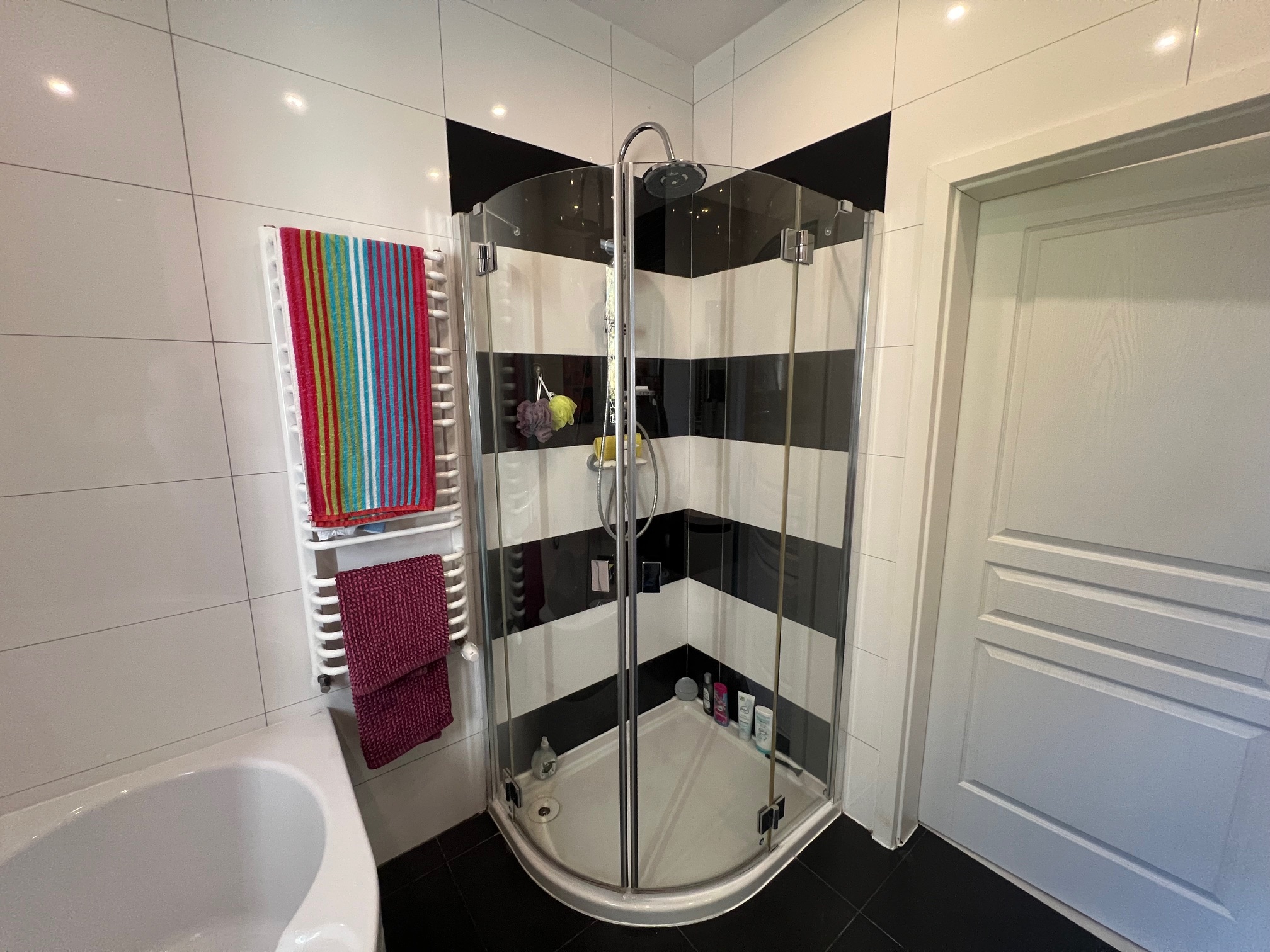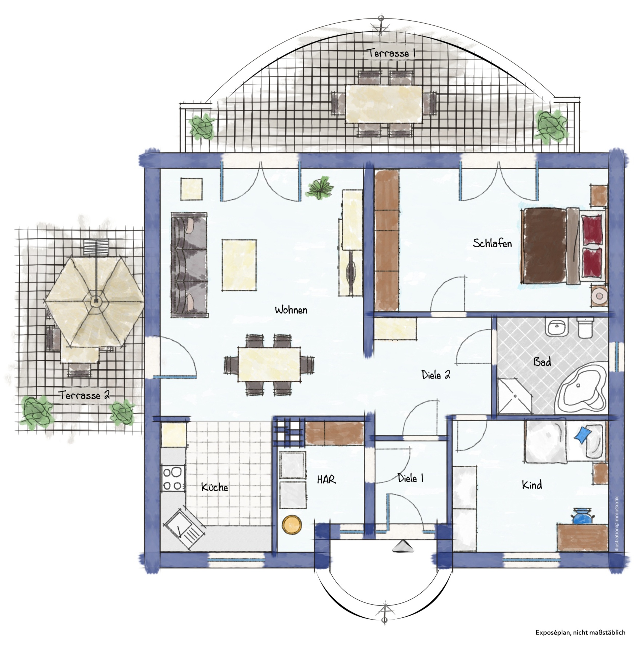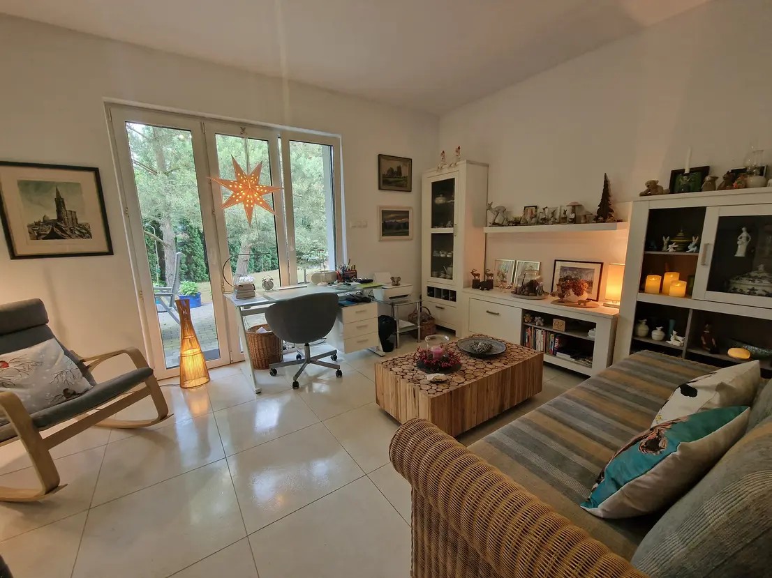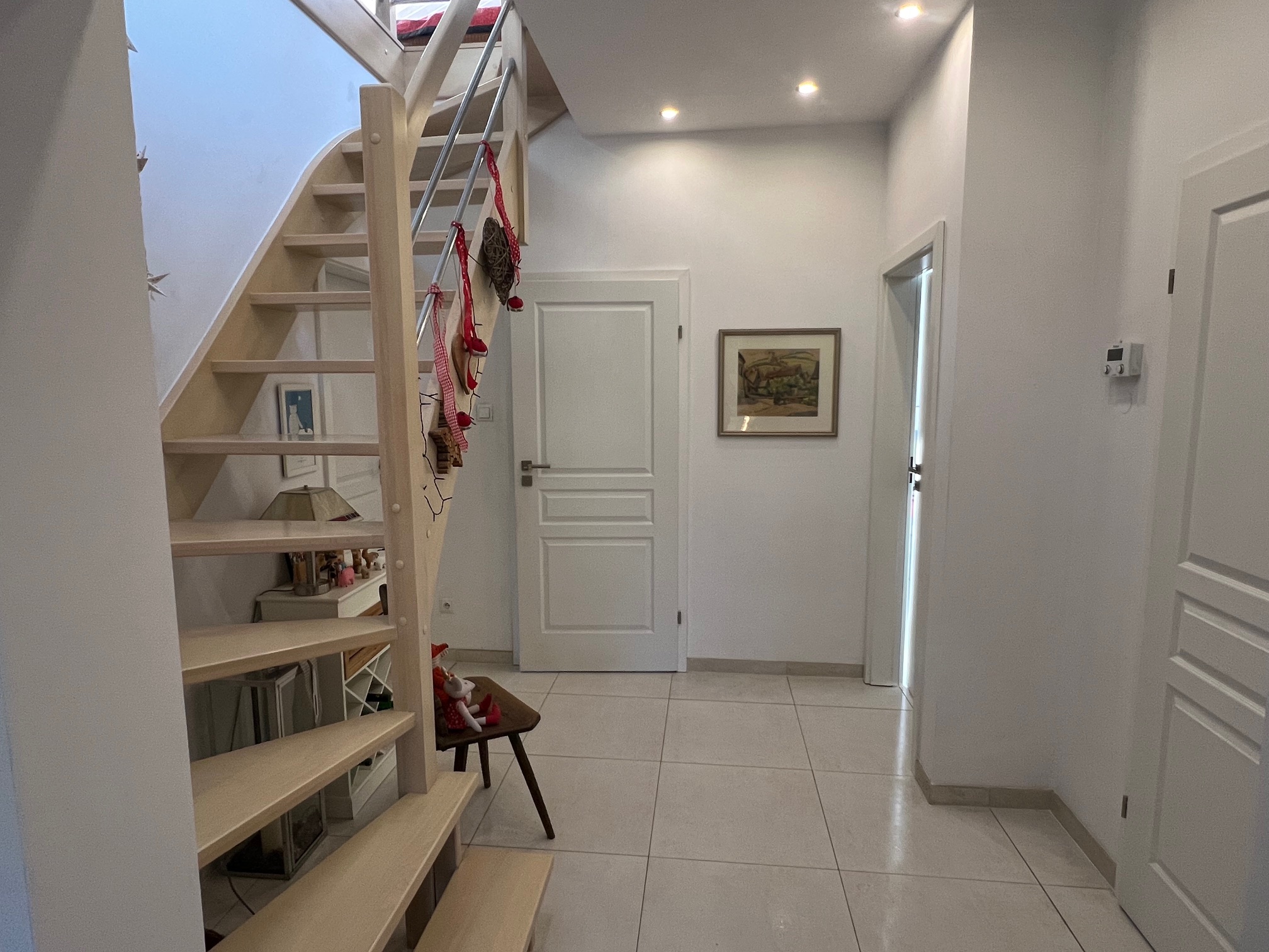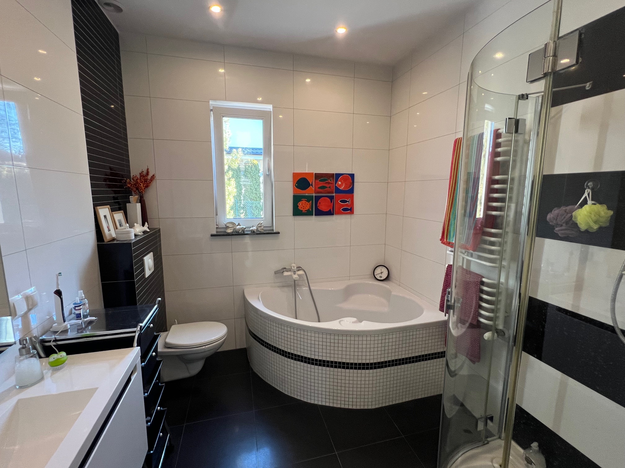 Durch die straßenseitige Haustür gelangt man durch einen kleinen Eingangsbereich in das Herzstück des Hauses, in den offenen Wohnbereich mit angrenzender Küche und Zugang zur Terrasse. Auf eine zweite Terrasse gelangt man durch die bodentiefen Fenster. Zwei weitere Zimmer und ein sehr schön ausgestattetes Bad befinden sich auf der anderen Seite. Eine Fußbodenheizung gehört ebenso zur Ausstattung, wie eine Einbauküche und elektrische Rollläden. Im EG sind alle Räume mit hochwertigen Fliesen ausgestattet. Über eine Treppe gelangt man nach oben in den ausgebauten Spitzboden. Dieser kann als Gästebereich, Hobby oder zur Anbieten genutzt werden.