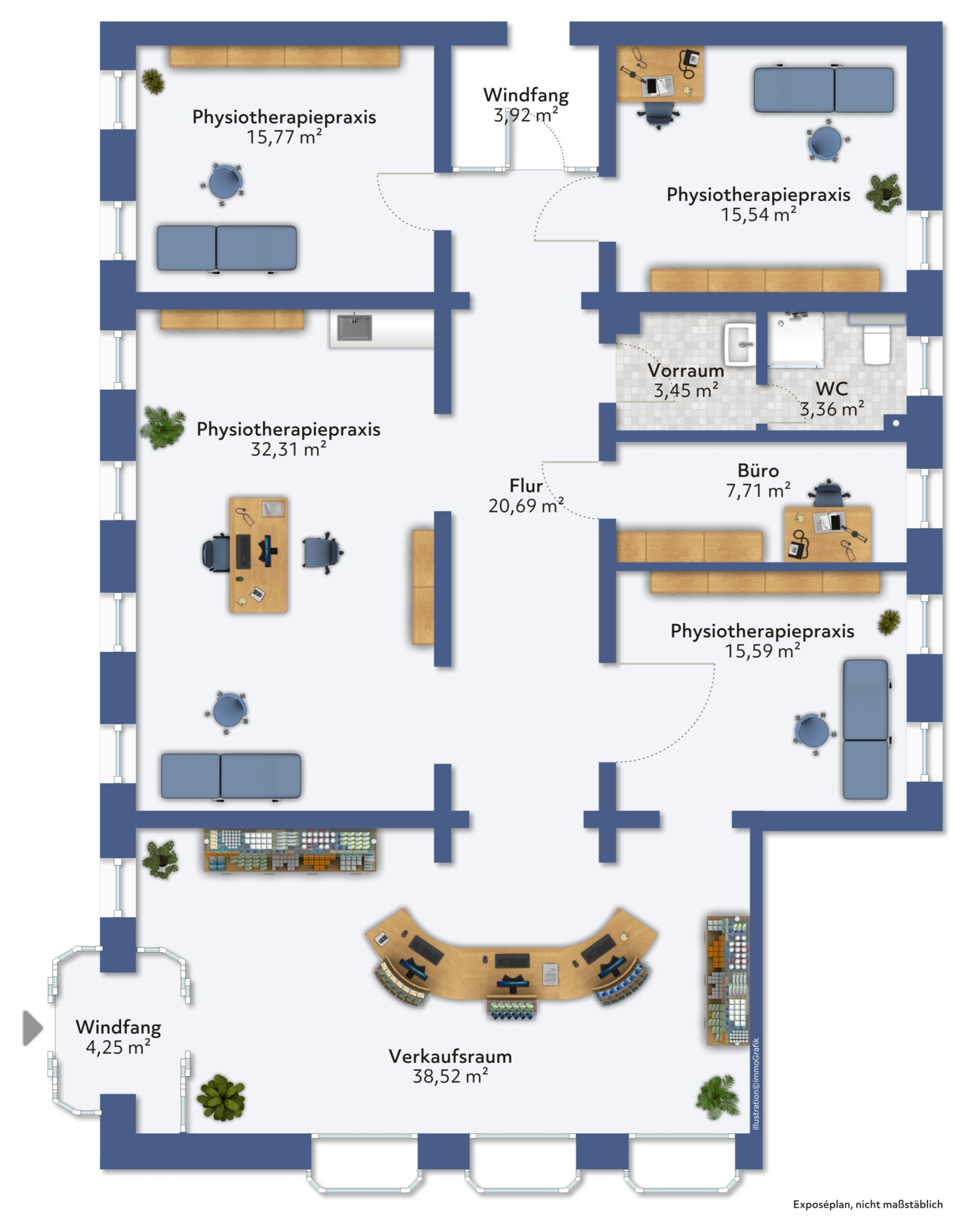 einen ebenerdigen Rollstuhl-gerechten Zugang öffnet sich der Eingangsbereich mit einer automatischen Glaseingangstür. Hier kommt man in einen großen Empfangsbereich / Verkaufsraum - je nach Nutzung. Von hier aus geht es in einen breiten Flur die Einheit entlang. Nach rechts und links zweigen die anderen Räume ab. Ein WC befindet sich im hinteren rechten Bereich.